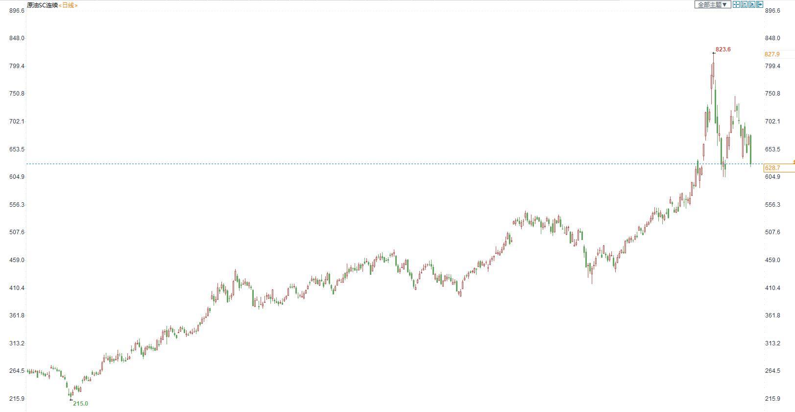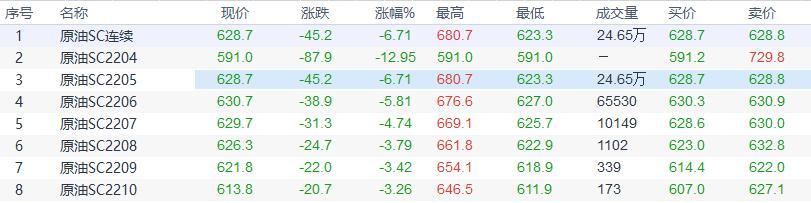 周四(4月7日)上海原油价格收盘下跌45.2元,跌幅6.71%。主力合约2205终盘收于628.7元/桶,跌6.71元/桶。油价收盘大跌,主要因为IEA宣布大幅抛售原油储备,且对俄新一轮制裁并没有禁原油,这给油价下行压力。