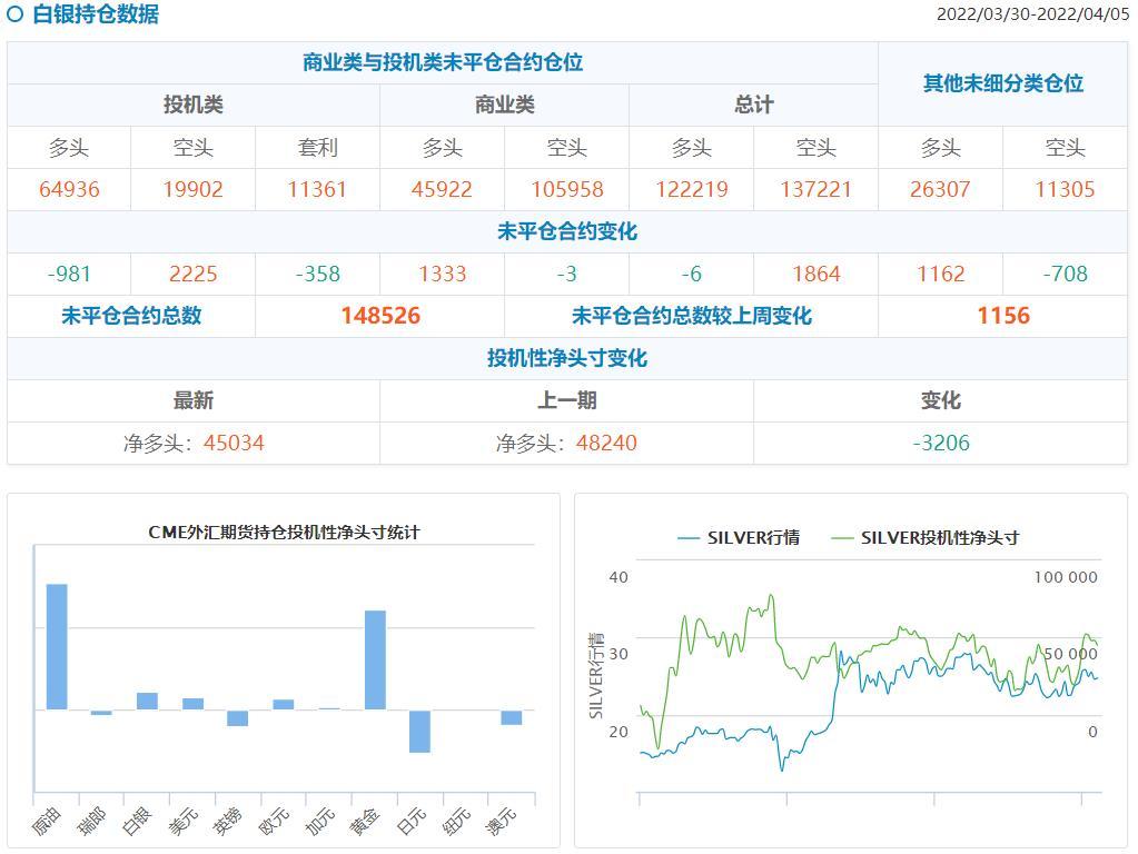 2、美国商品期货交易委员会(CFTC)数据显示,截止3月30日至4月5日当周,投机者持有的白银投机性净多头头寸减少3206手,至45034手合约,表明投资者看多白银的意愿出现降温。投机者所持COMEX白银净多头头寸降至39321手合约,创最近六周新低。