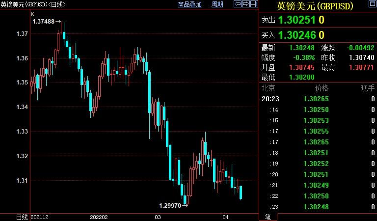 英镑兑美元下跌0.63%至1.3026,创3月15日以来新低。对英国央行快速升息的押注减弱利空英镑。此外,在西方国家表示需要对俄罗斯实施新的制裁后欧元走低,也拖累了英镑。