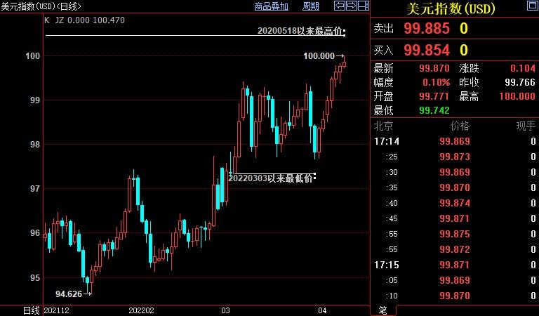 截至发稿,现货黄金累计上涨0.34%至1931.55美元/盎司;美元指数暴涨1.30%至99.871,盘中升破100关口,创2020年5月以来新高,有望得一个月来的最大周度涨幅。