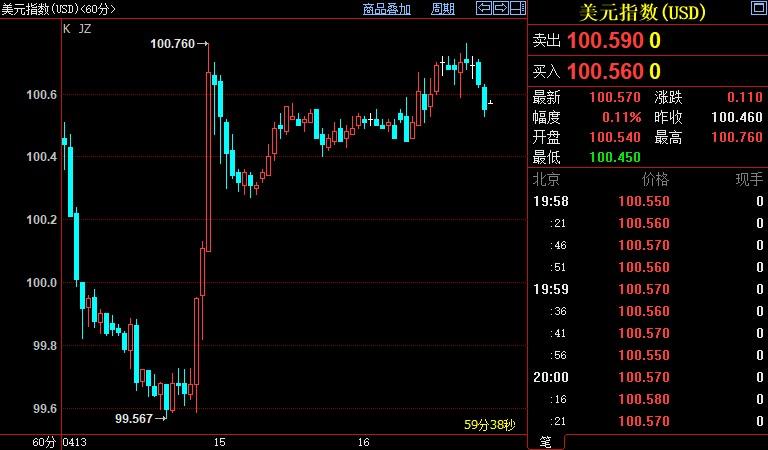 北京时间19:59,现货黄金上涨0.88%至1991.88美元/盎司;COMEX期金主力合约上涨1.11%至1996.8美元/盎司;美元指数上浮0.07%至100.572。