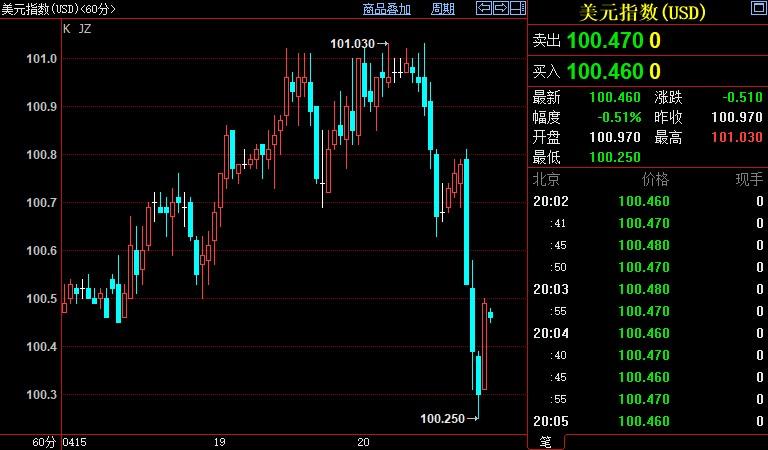 北京时间20:04,现货黄金上浮0.06%至1951.13美元/盎司;COMEX期金主力合约下跌0.28%至1953.5美元/盎司;美元指数下跌0.51%至100.466。美指早盘创2020年3月下旬以来新高至101.038。