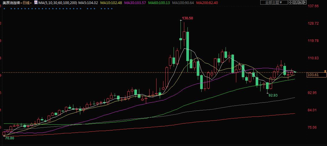 周五(4月22日)亚洲时段,美油现报103.58美元/桶;油价周四上涨,受助于市场担心供应会收紧,欧盟正考虑可能禁止从俄罗斯进口石油,这会进一步限制全球石油贸易。