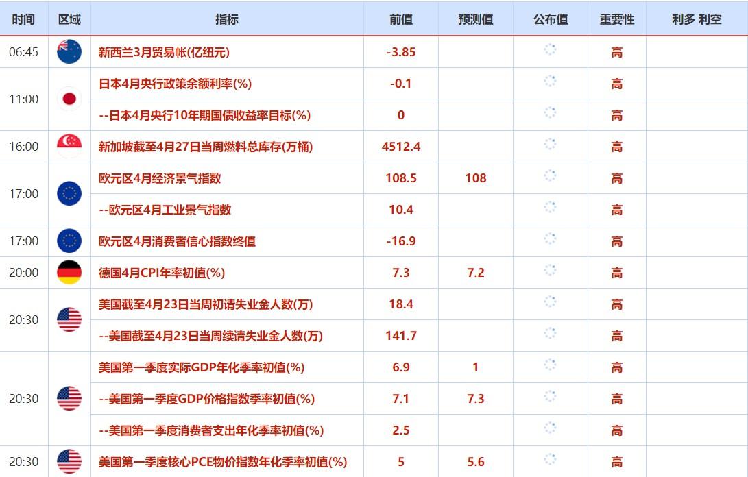 周四(4月28日)关键词:美国截至4月23日当周初请失业金人数,美国第一季度实际GDP,日本央行利率决议