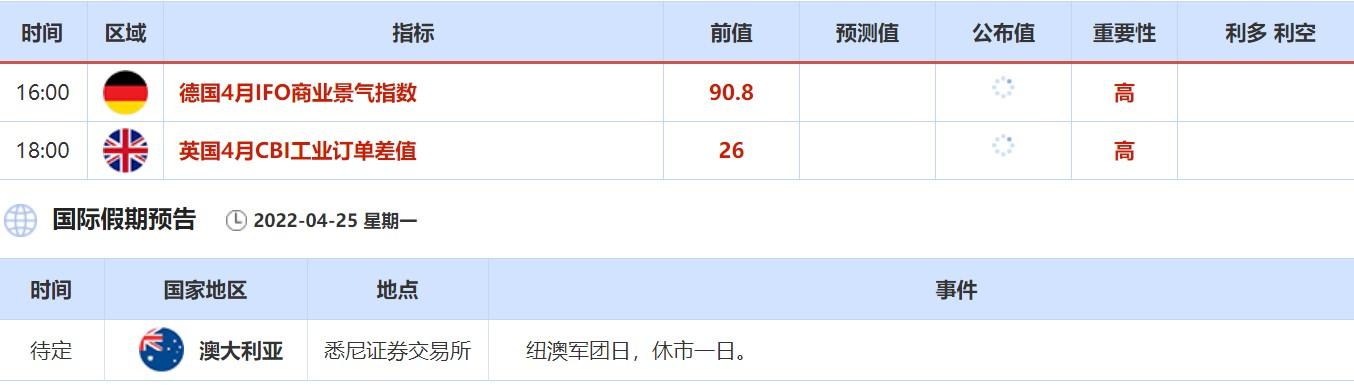 周一(4月25日)关键词:英国4月CBI工业订单差值,澳洲纽澳军团日