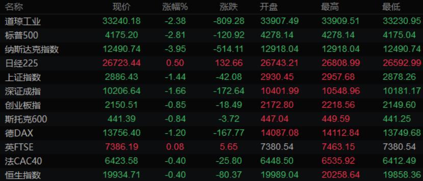美股收盘情况:道琼斯指数收盘下跌777.93点,跌幅2.28%,报33271.53点;标普500指数收盘下跌122.05点,跌幅2.84%,报4174.07点;纳斯达克综合指数收盘下跌494.85点,跌幅3.81%,报12510.00点。