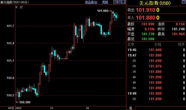 北京时间19:47,现货黄金上浮0.33%至1903.80美元/盎司;COMEX期金主力合约上涨0.47%至1905.0美元/盎司;美元指数上涨0.14%至101.89。