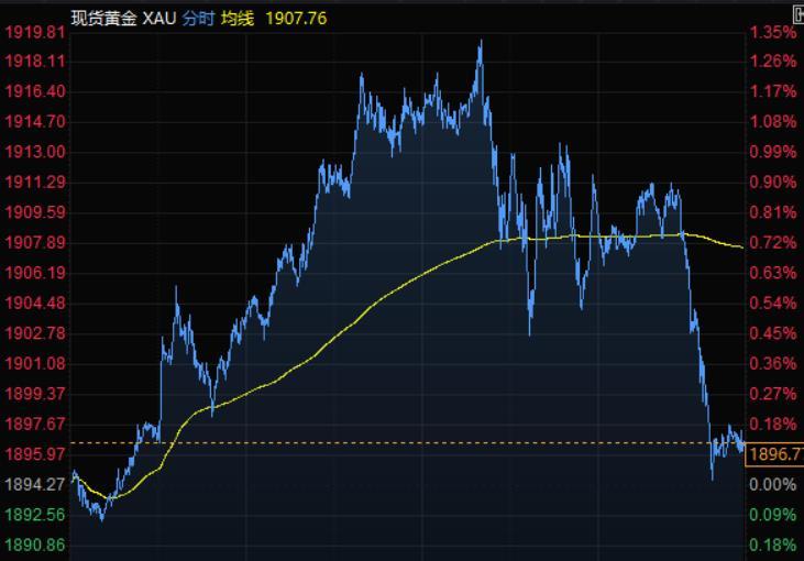 现货黄金冲高回落,盘中一度刷新近四日高点至1919.81美元/盎司,尾盘失守1900关口,此前美元下跌,但由于投资者押注美联储将采取激进的紧缩政策,本月累跌2.08%。