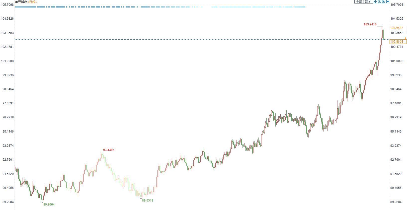由于美联储收紧货币政策力度强于大多数主要经济体央行,同时乌克兰危机令欧洲经济前景恶化并推升市场避险需求,衡量美元对六种主要货币的美元指数近日连续显著走高,本周28日盘中一度触及103.94,创2002年以来新高。