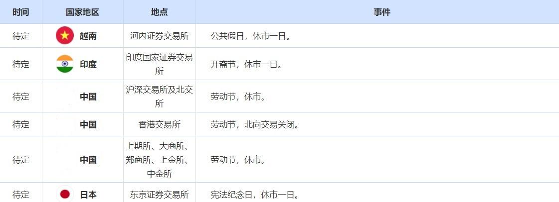 5月3日投资者还需关注当天全球各大交易所的休市公告。、