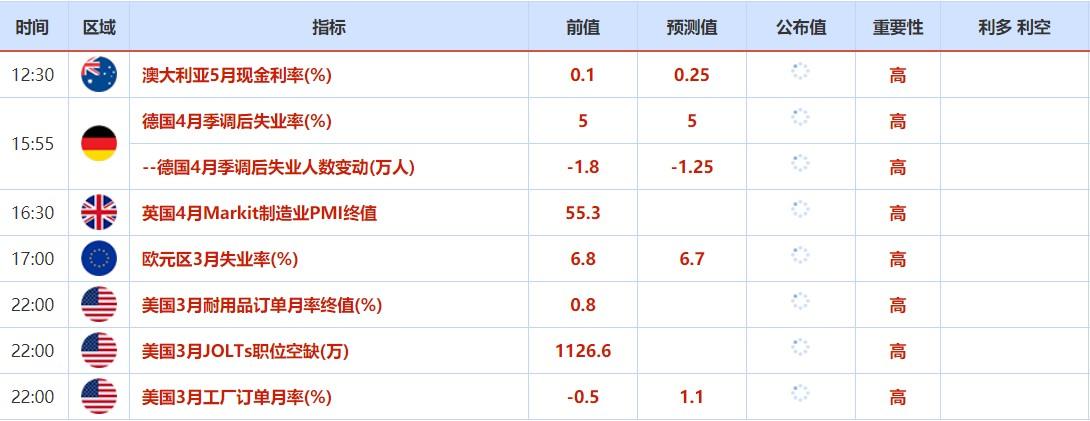周二(5月3日)关键词:澳洲联储利率决议,美国3月耐用品订单