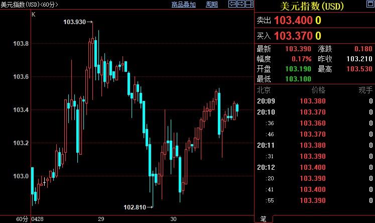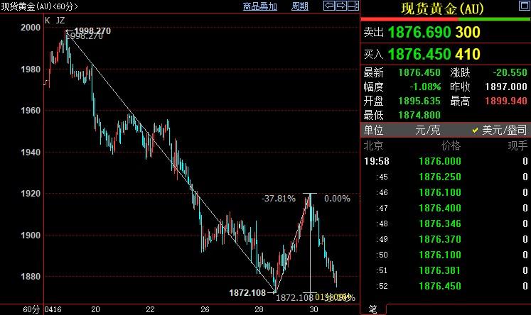 北京时间20:14,现货黄金下跌1.23%至1873.46美元/盎司;COMEX期金主力合约下跌2.00%至1873.4美元/盎司;美元指数上浮0.19%至103.394。