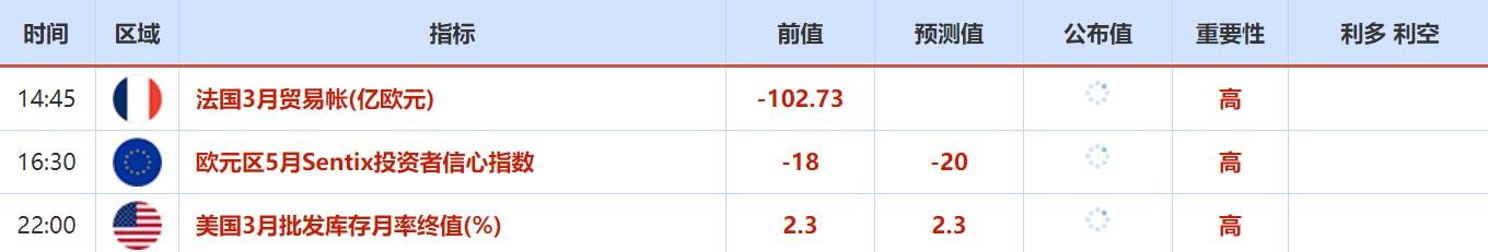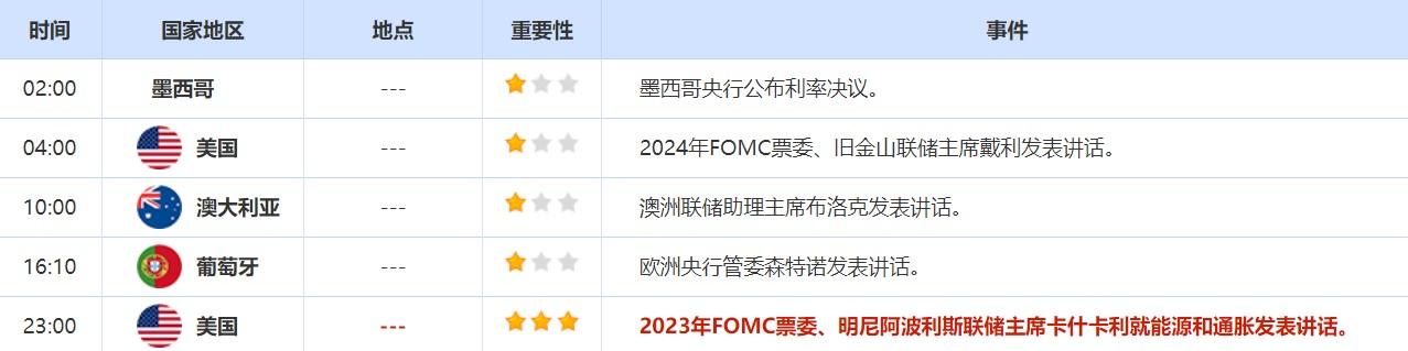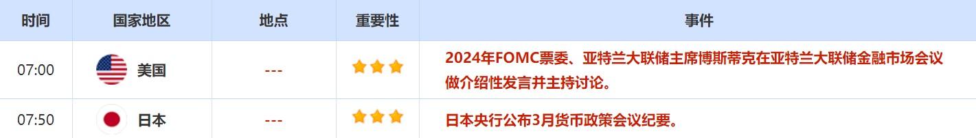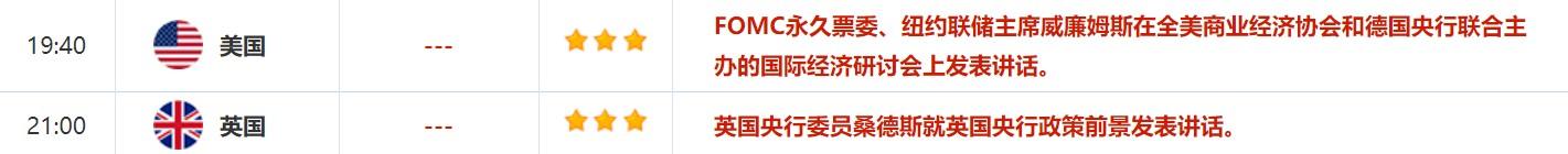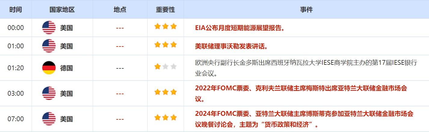 5月11日,亚特兰大联储主席博斯蒂克参加亚特兰大联储金融市场会议晚餐讨论会,主题为“货币政策和经济”。此外,克利夫兰联储主席梅斯特出席亚特兰大联储金融市场会议。投资者也需关注这两位美联储官员的讲话。