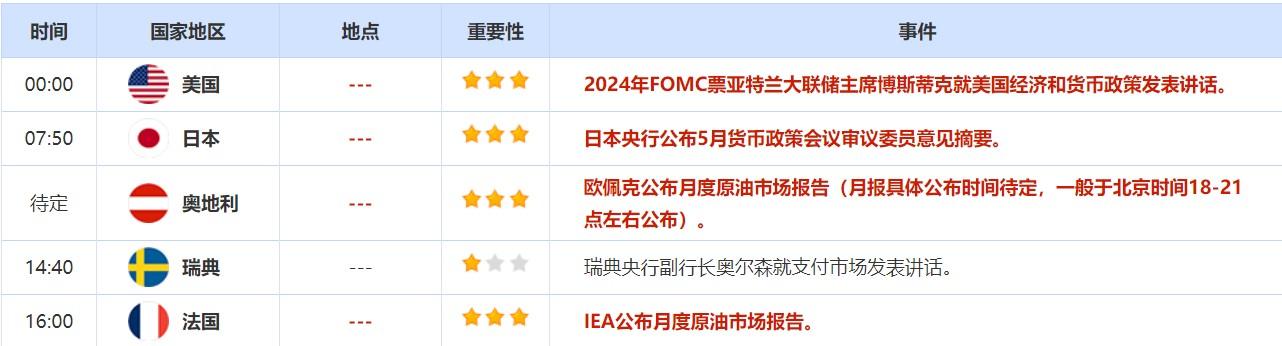 5月12日,2024年FOMC票亚特兰大联储主席博斯蒂克就美国经济和货币政策发表讲话。投资者还需关注欧佩克以及IEA的月度原油市场报告。