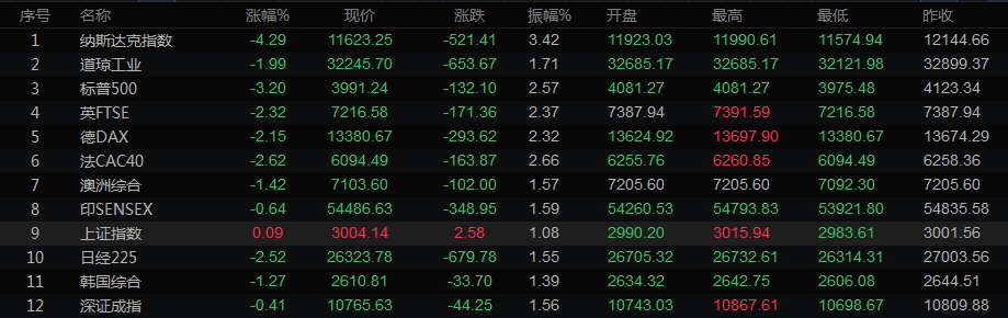 截至收盘,道琼斯工业指数下跌653.67点,或1.99%,至32245.7点;标普500指数大跌132.1点,或3.20%,至3991.24点,创2021年3月31日以来最低收盘水平;纳斯达克指数急挫521.41点,或4.29%,至11,623.25点。