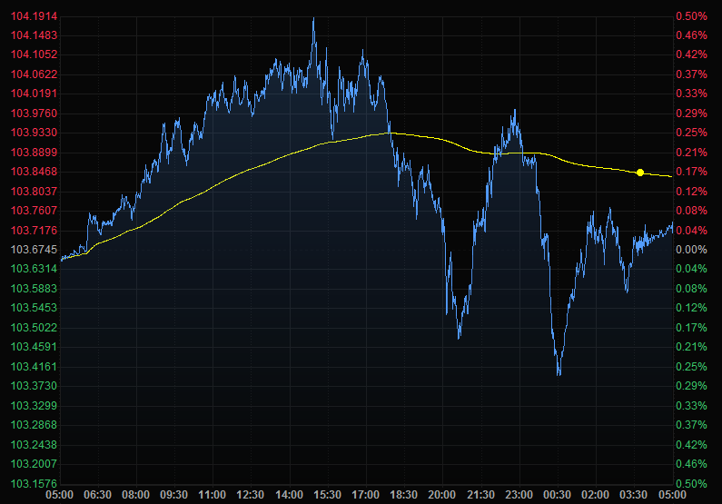 美元指数周一盘中最高触及104.19,为2002年12月以来最高,收报103.71,基本持平。欧元兑美元上升0.15%,报1.0556。