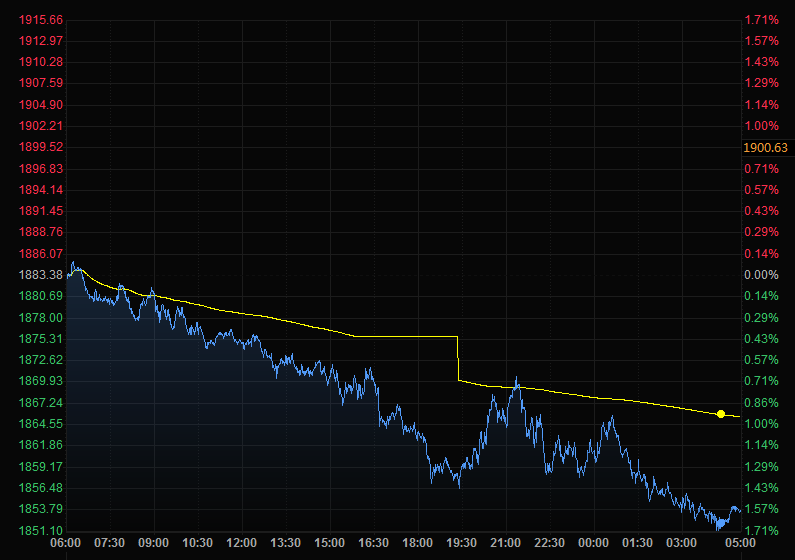 黄金价格周一继续回落,跌幅超过1%,随着美元在近20年高点徘徊,黄金的吸引力减弱。现货黄金跌1.4%,收报每盎司1853.92美元。美国黄金期货下跌1.3%,收报每盎司1,858.60美元。