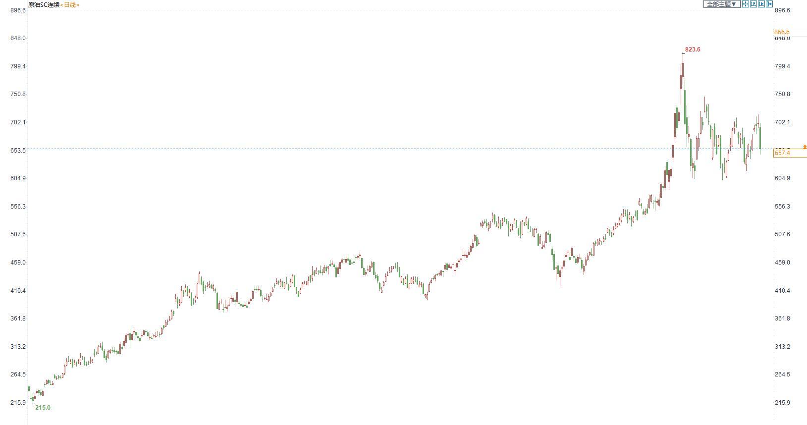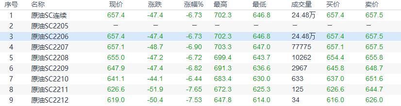 周二(5月10日)上海原油价格收盘大跌47.4,跌幅6.73%。主力合约2206终盘收于657.4元/桶,跌6.73元/桶。油价收盘大跌,整体依然维持在震荡区间中,投资者继续担忧央行收紧政策、高通胀和全球经济成长放缓,拖累原油市场。