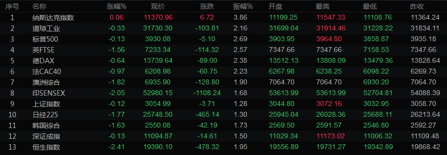 截至收盘,道琼斯工业指数下跌103.81点,或0.33%,至31730.3点;标普500指数下跌5.1点,或0.13%,至3930.08点;纳斯达克指数上涨6.73点,或0.06%,至11370.96点。
