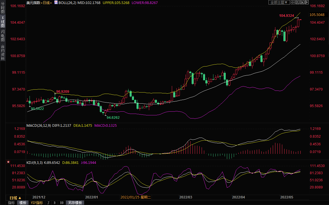 美元周四再度刷新近20年高点至104.93,收报104.75,涨幅约0.7%,市场持续担心,主要央行遏制高通胀的行动将抑制全球经济增长,这令美元的避险吸引力增强。
