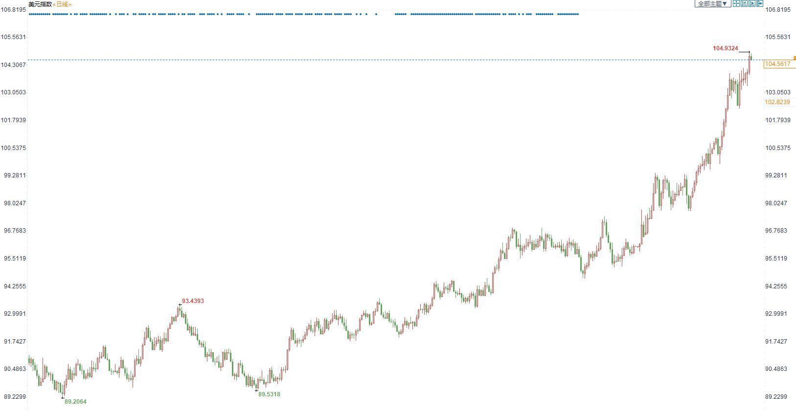 今年2月以来,俄乌冲突曾经触发过美元指数新一轮上涨,随后一路高歌猛进。到4月11日,美元指数再度突破100关卡,并继续冲高。在美联储宣布开启新一轮加息周期后,美元指数依旧加速上涨,并创下近20年来的新高。