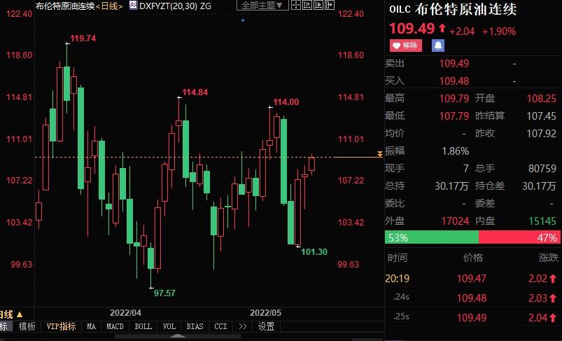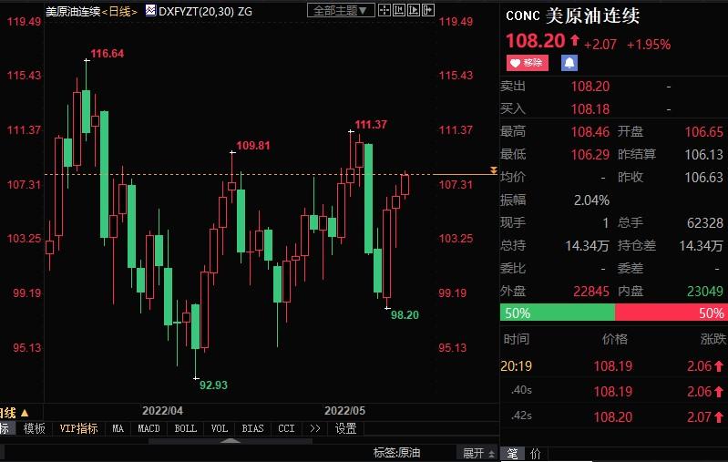 截至发稿,北京时间20:18,NYMEX原油期货下跌2.19%至108.19美元/桶;ICE布伦特原油期货下跌3.31%至109.47美元/桶。两市周初创4月26日以来新低,分别至98.20美元/桶和101.30美元/桶。