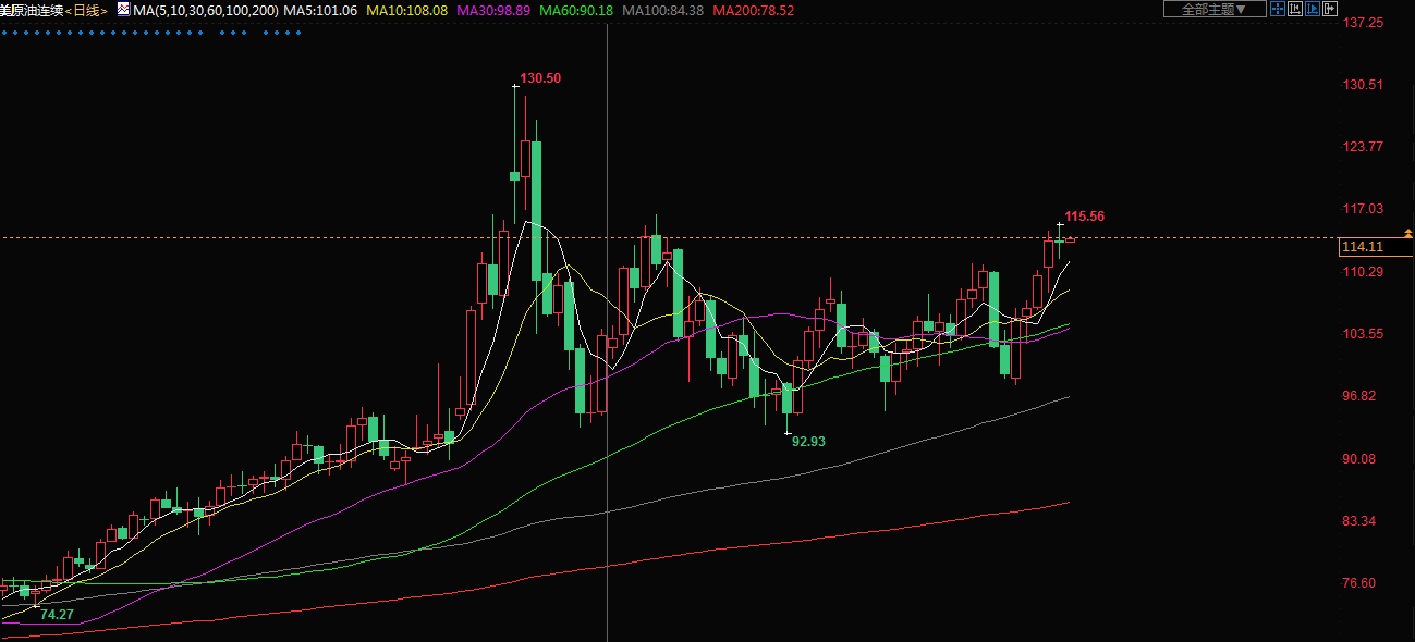 周三(5月18日)亚洲时段,美油徘徊于114美元/桶;油价周二盘中一度刷新3月9日以来新高至115.56后回落,有消息称,美国将放松对委内瑞拉政府的一些限制,委内瑞拉原油供应或增加的预期拖累油价。