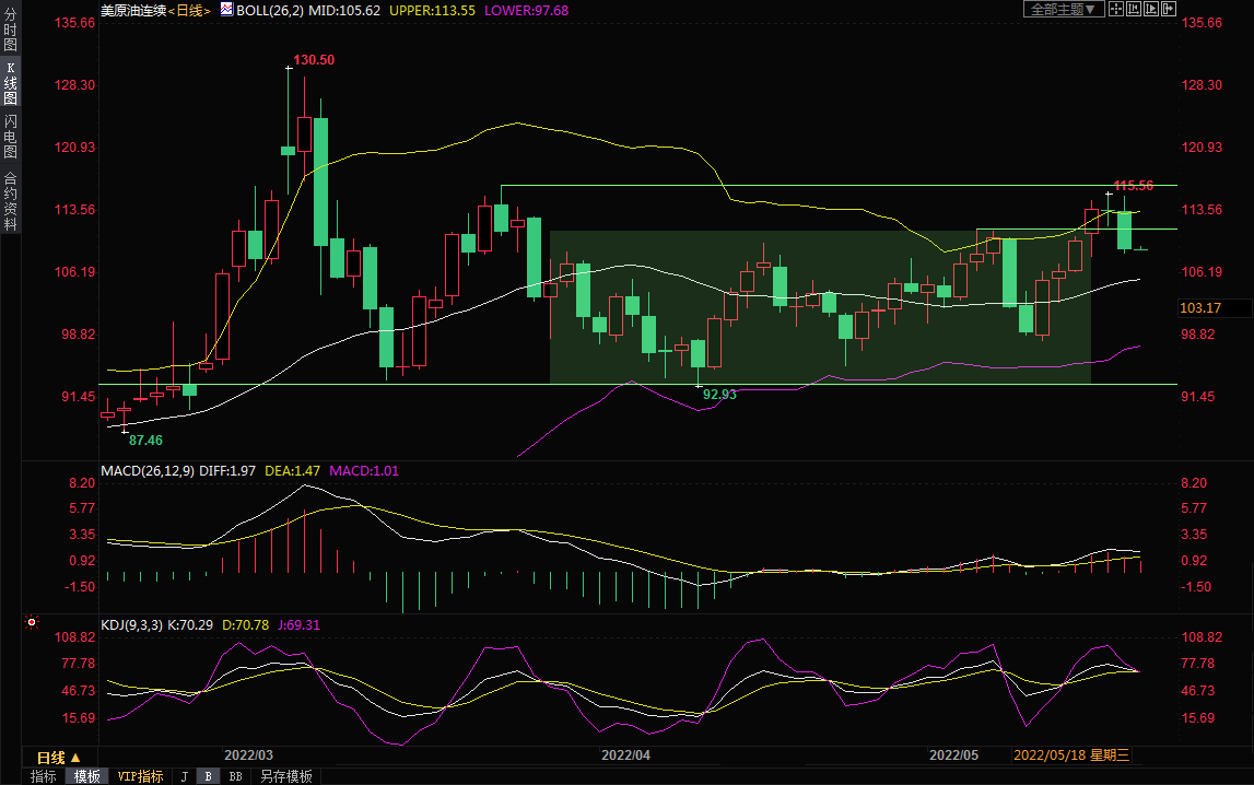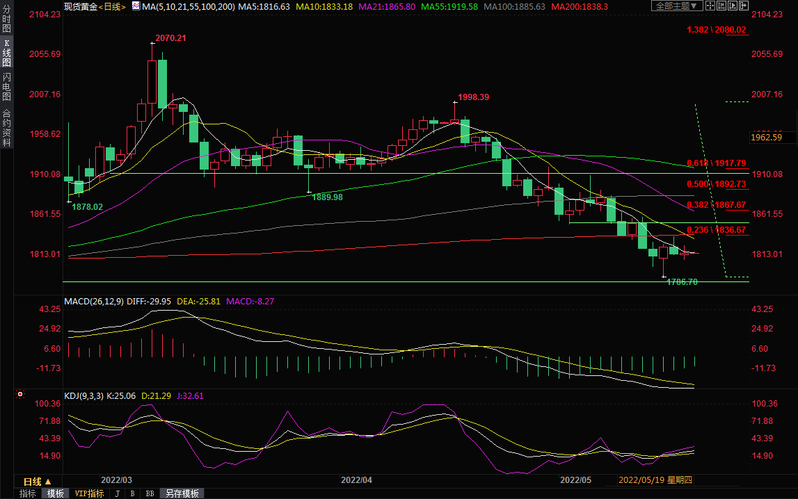 周四(5月19日)亚市盘初,现货黄金窄幅震荡于1816美元附近,尽管美元周三上涨令金价承压,但美股大跌,标普500指数和道指创近两年最大跌幅,也给金价提供避险支撑;美原油在周三下跌近4%后,周四一度下跌近2%,创本周新低至107.59美元/桶,明显受到美股大跌的拖累,而且精炼油库存意外增加、美国原油产量增加、亚洲疫情担忧情绪回升,都令油价承压;从技术面来看,短线油价见顶风险显著增加。