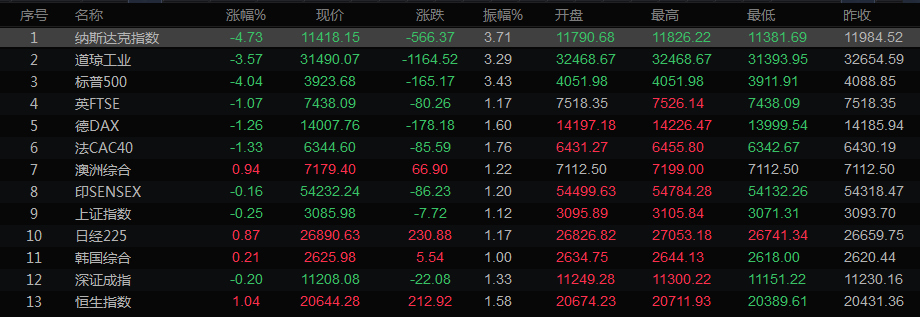 美股收盘方面,标普500指数和道指创近两年最大跌幅,标普500指数重挫4.04%,收于3923.68点;纳斯达克指数崩跌4.73%,至11418.15点;道琼斯工业指数大跌3.57%,至31490.07点。