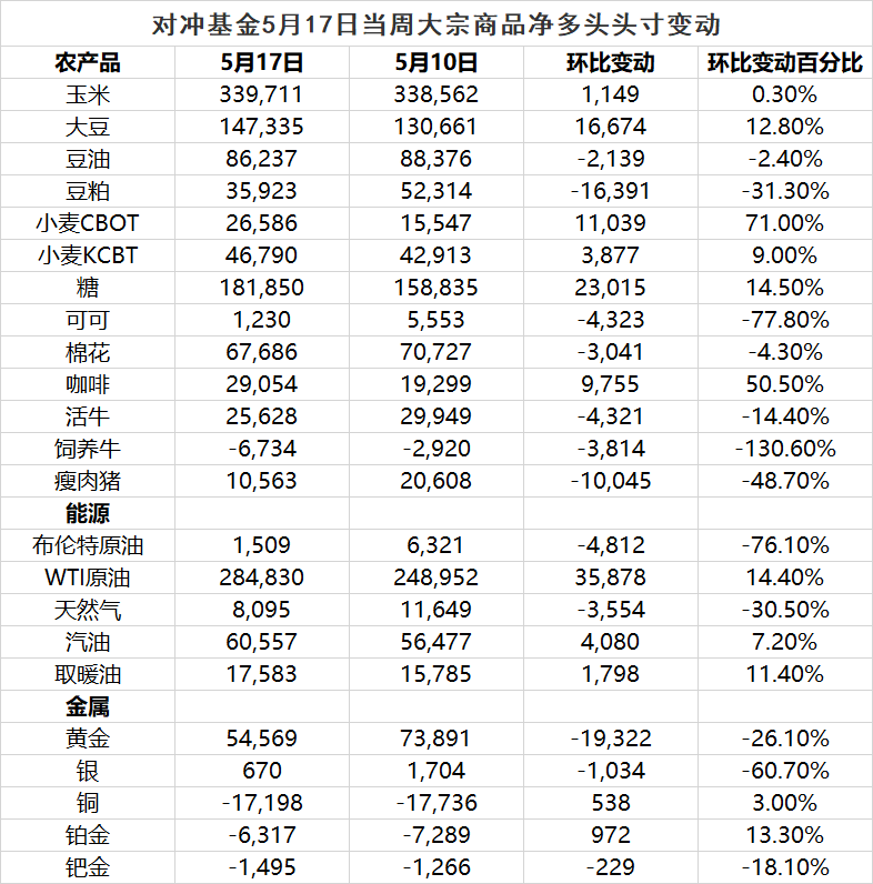 附图:5月10日至5月17日当周,对冲基金大宗商品净多头头寸变动(来源:CFTC)