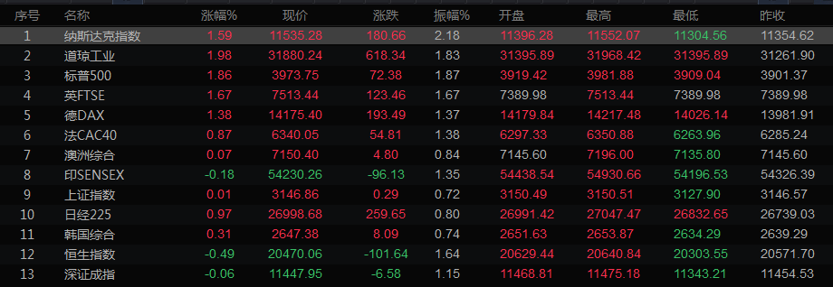 道琼斯工业指数上涨618.34点,或1.98%,至31880.24点;标普500指数上涨72.39点,或1.86%,至3973.75点;纳斯达克指数上涨180.66点,或1.59%,至11535.28点。