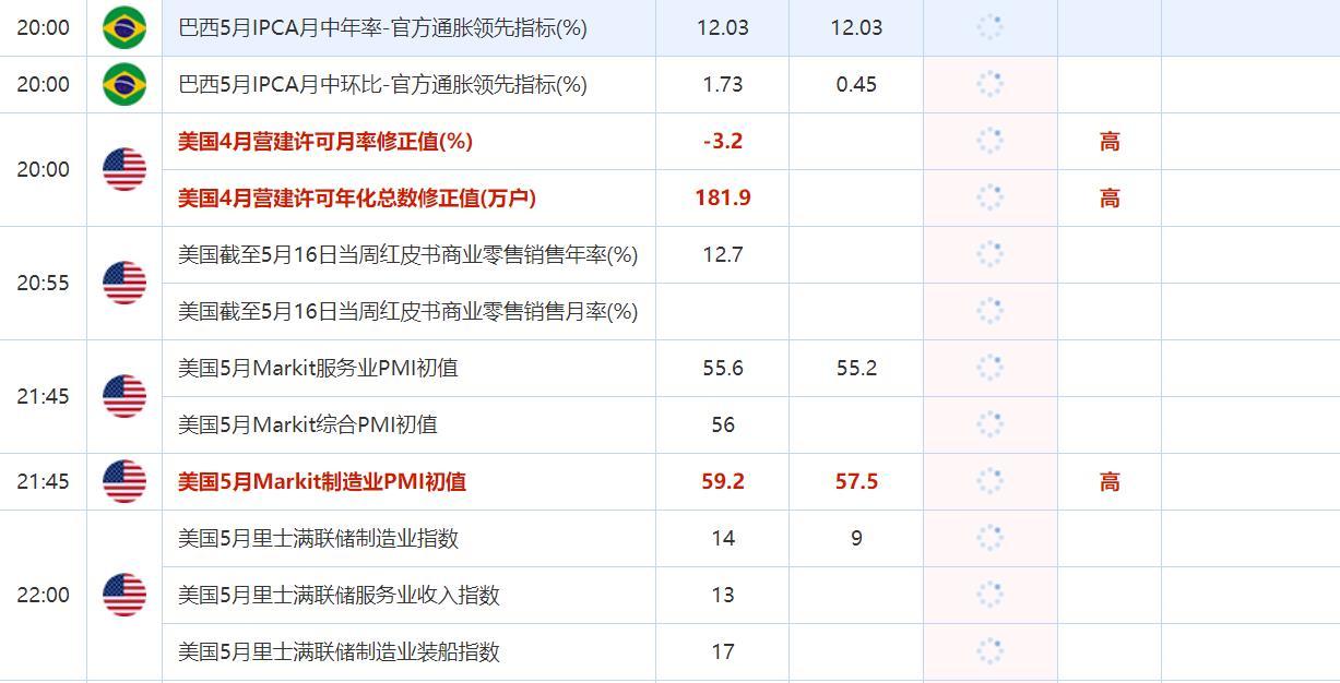 2022年5月24日,全球主要经济体将公布重要数据,需重点关注欧洲多国和美国的Markit制造业PMI,英国5月CBI零售销售差值,美国4月营建许可月率修正值,美国4月营建许可月率,以及美国4月季调后新屋销售年化总数(。大事方面需关注亚特兰大联储主席博斯蒂克就经济前景发表的讲话,以及堪萨斯联储主席乔治发表的讲话。