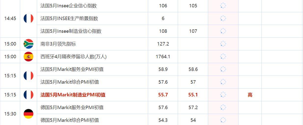 14:45 法国5月Insee企业信心指数 , 前值 106 , 预期值 105 , 公布值:待发布