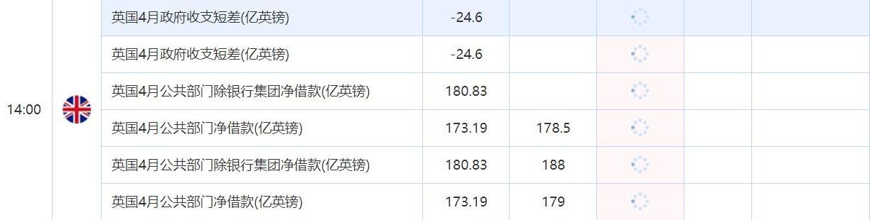 14:00 英国4月公共部门除银行集团净借款(亿英镑) , 前值 180.83 , 预期值 -- , 公布值:待发布