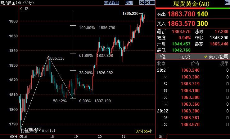 小时图上看,金价自1807美元开启上行iii浪,升破100%目标位1857美元,并有望进一步上摸138.2%目标位1876美元。iii浪是自1786美元开启的上行(i)浪的子浪。