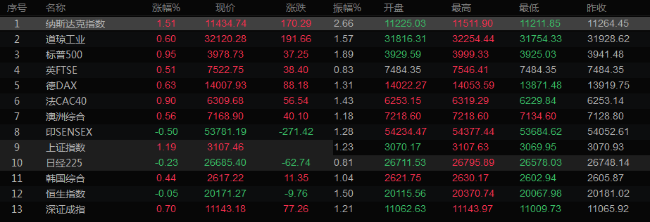 截至收盘,道琼斯工业指数上涨191.66点,或0.6%,至32120.28点;标普500指数上涨37.25点,或0.95%,至3978.73点;纳斯达克指数上涨170.29点,或1.51%,至11434.74点。