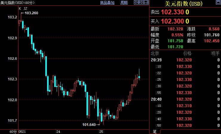 北京时间20:40,现货黄金下跌0.57%至1856.06美元/盎司;COMEX期金主力合约下跌0.57%至1854.8美元/盎司;美元指数上涨0.56%至102.326。