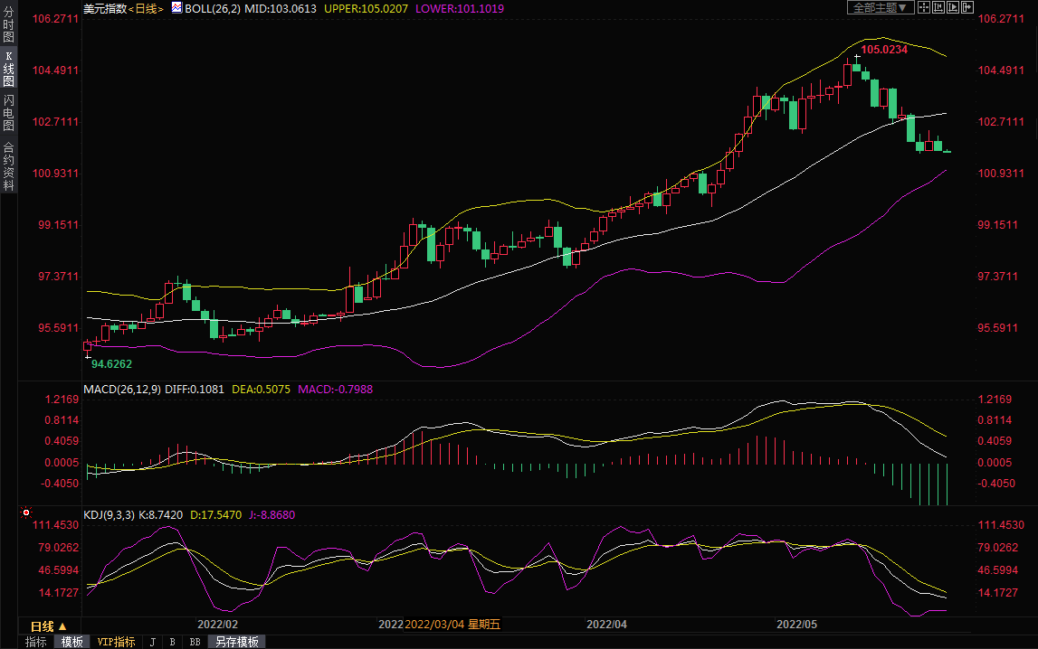 美元指数本月稍早触及105上方的近20年高点,但有迹象显示,美联储的激进行动可能已经在放缓经济增长,促使交易商缩减紧缩押注,美国公债收益率(殖利率)也从多年高位回落。