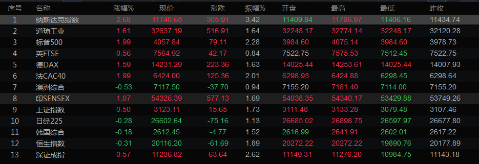 道琼斯工业指数上涨516.91点,收于32637.19点,涨幅1.61%;标普500指数上涨79.11点,涨幅1.99%,报收4057.84点;纳斯达克指数大涨305.91点,或2.68%,报11740.65点。