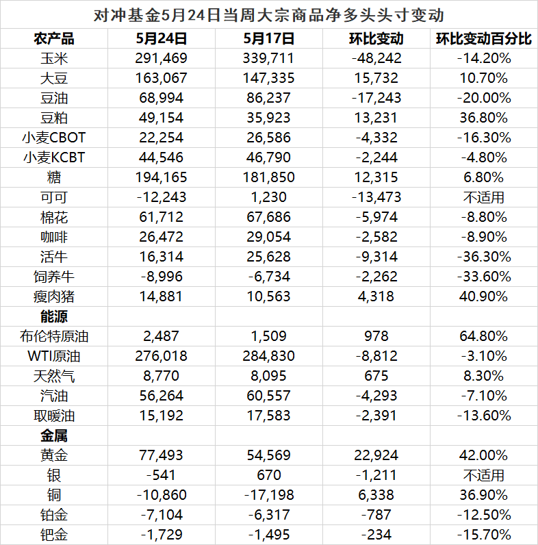附图:5月18日至5月24日当周,对冲基金大宗商品净多头头寸变动(来源:CFTC)