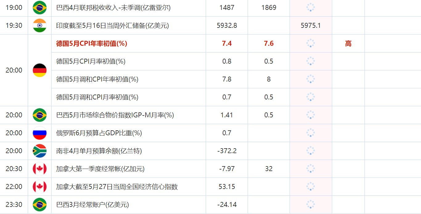 20:00 德国5月CPI年率初值(%) , 前值 7.4 , 预期值 7.6 , 公布值:待发布