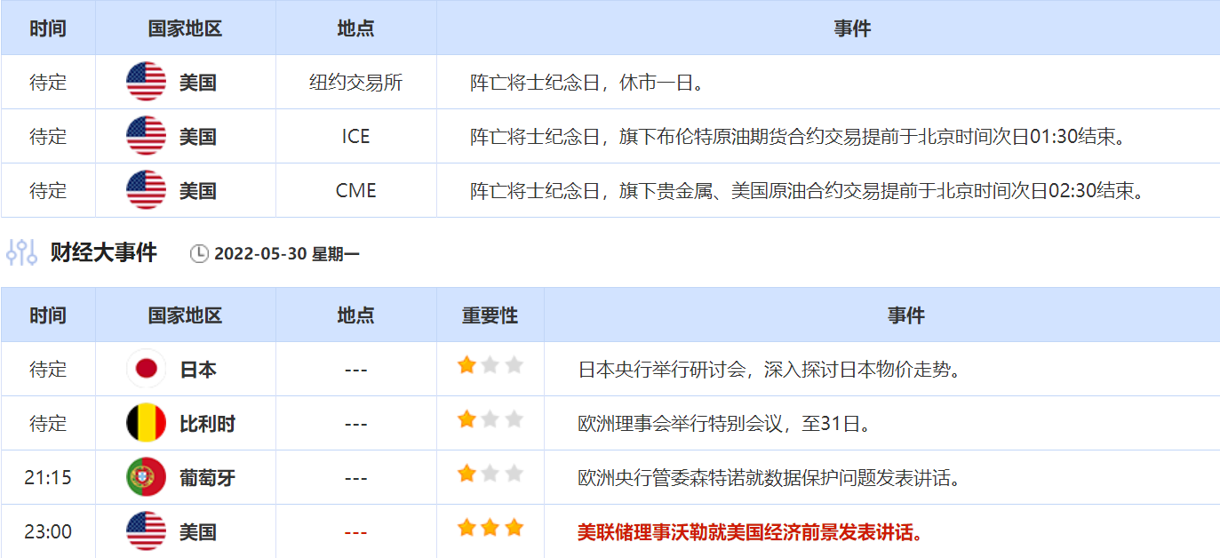 2022年5月30日,全球主要经济体将公布重要数据,需重点关注欧元区5月经济景气指数,欧元区5月消费者信心指数终值,加拿大5月CFIB商业晴雨表和德国5月CPI年率初值。大事方面需关注美联储理事沃勒就美国经济前景发表讲话。此外需关注阵亡将士纪念日美国各交易所的休市公告。