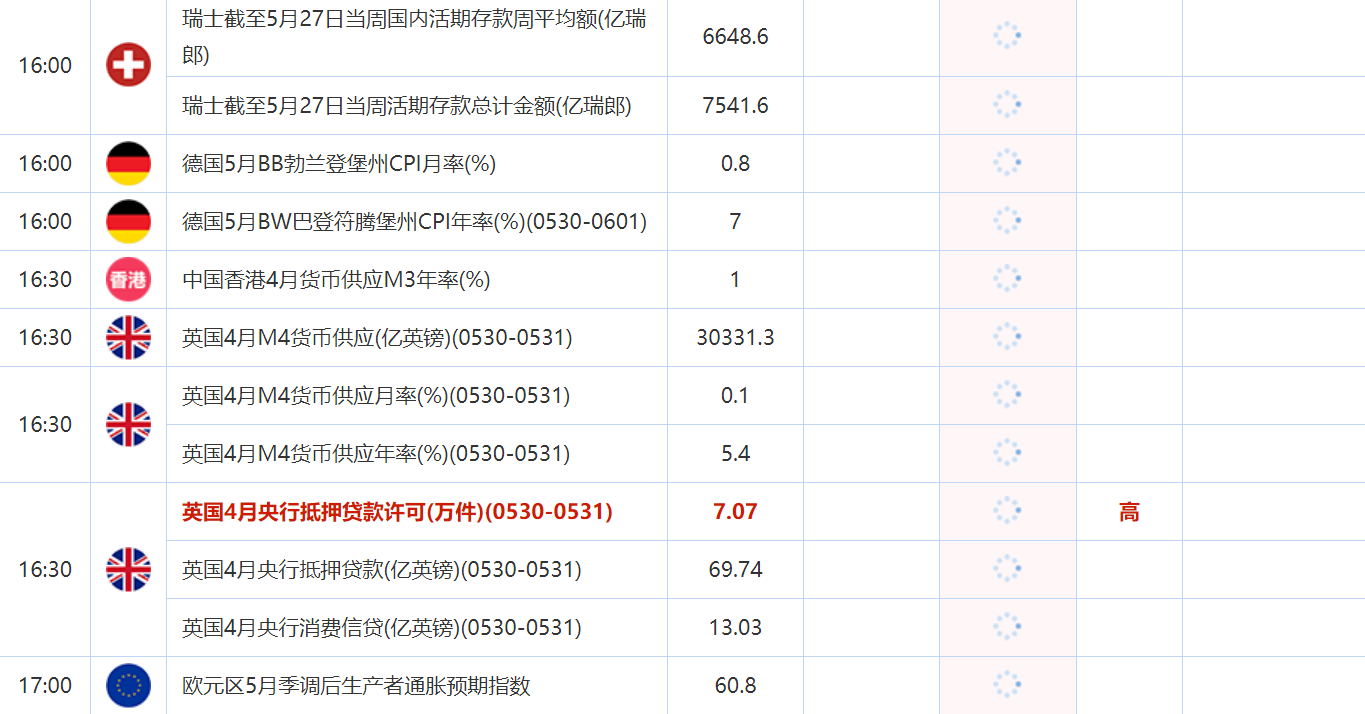 16:30 英国4月M4货币供应月率(%)(0530-0531) , 前值 0.1 , 预期值 -- , 公布值:待发布
