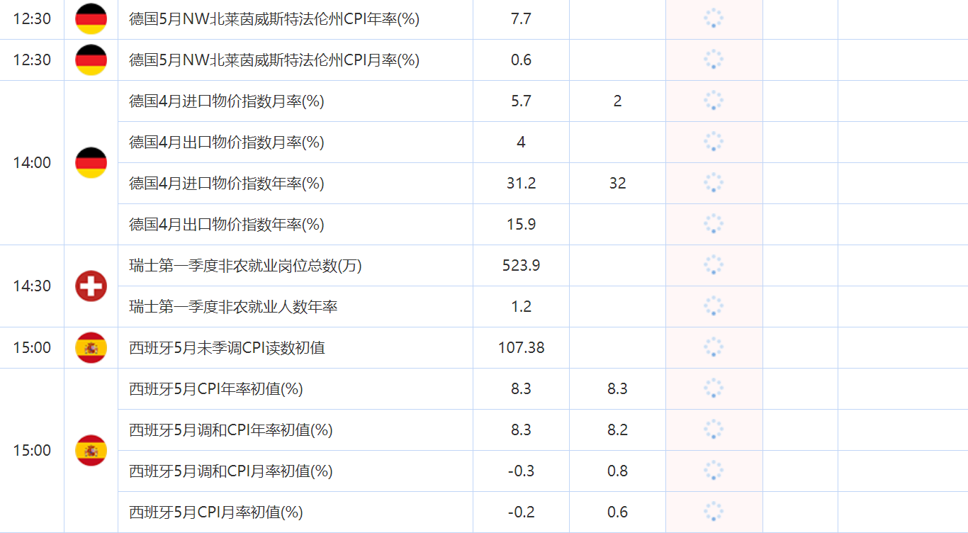 15:00 西班牙5月调和CPI年率初值(%) , 前值 8.3 , 预期值 8.2 , 公布值:待发布