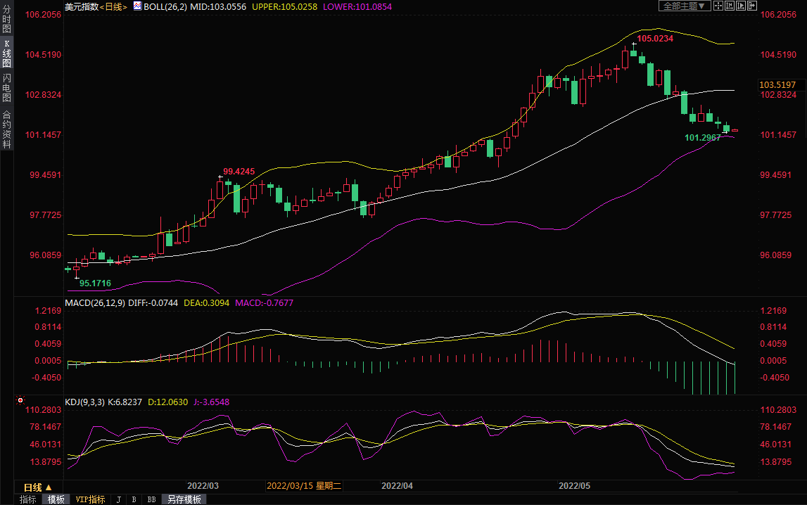 5月份美元指数有望下跌1.5%以上,但仍较上年同期上涨约6%。周一尾盘收跌0.3%,报101.35。