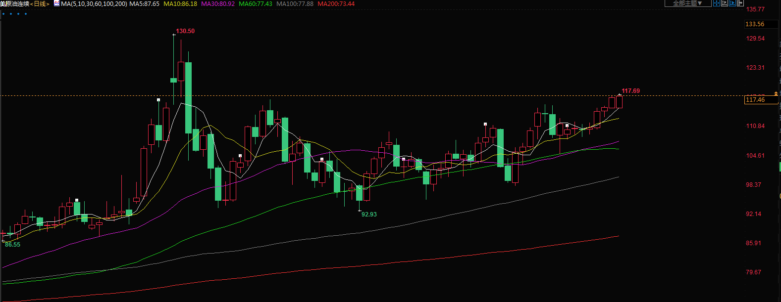 周二(5月31日)亚洲时段,美油延续涨势,创下3月10日以来最高至117.69美元/桶;因疫情封控放松,欧盟峰会制裁俄石油产品,供给紧张助力油价上涨。