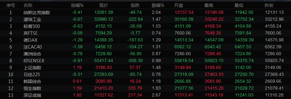 道琼斯工业指数下跌222.84点,或0.67%,至32990.12点;标普500指数下跌26.09点,或0.63%,至4132.15点;纳斯达克指数下跌49.74点,或0.41%,至12081.39点。