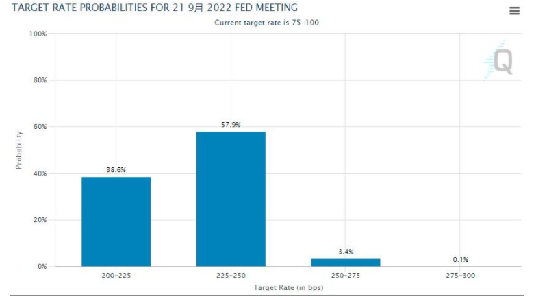 在沃勒周一讲话后,芝加哥商品交易所(CME)的数据显示,市场对美联储将采取持续大幅加息的预期重新升温——投资者目前对9月议息会议后联邦基金利率升至2.25%-2.50%之间(未来三次会议均加息50基点)的预期再度来到了58%,高于本周伊始的37%。
