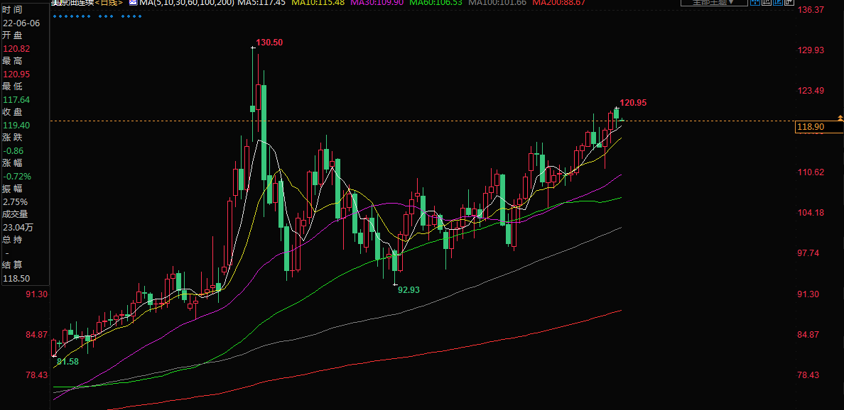 周二(6月7日)亚洲时段,美油现报118.92美元/桶;油价周一震荡交易后小幅收低,尽管沙特阿拉伯上调7月原油价格,但外界怀疑OPEC+产油国上调产量目标能否缓解供应紧张;且印度寻求从俄罗斯石油公司增加俄油进口量,油价回落至120美元/桶下方。