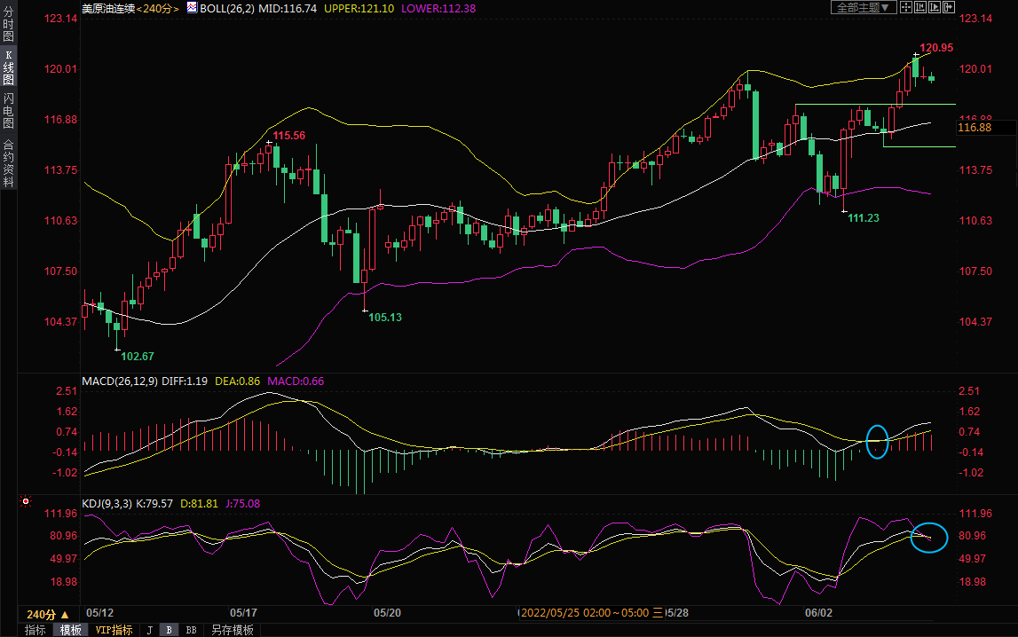 因为MACD金叉信号仍在,若油价能够守在117.77上方,则油价有望继续震荡走高。